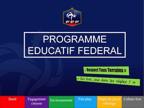Inculquer les valeurs inhérentes à la pratique sportive aux jeunes de 6 à 18 ans, telle est la vocation du programme educatif féféral . Le football a identifié ces valeurs sous le sigle : P.R.E.T.S (le Plaisir, le Respect, l’Engagement, la Tolérance et la Solidarité), et le programme éducatif fédéral propose de leur donner corps dans le cadre des activités du club.