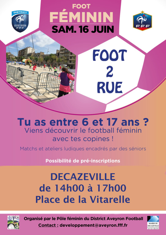 Dans le cadre de la promotion du football féminin, le District Aveyron Football organise (Avec la contribution du Club J.S.Bassin Aveyron) une opération « Foot2Rue ».